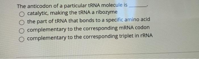 Solved 21 The Anticodon Of A Particular Trna Molecule Is Complementary To The Corresponding Triplet In Rrna Complementary To The Corresponding Mrna Codon The Part Of Trna That Bonds To A Specific